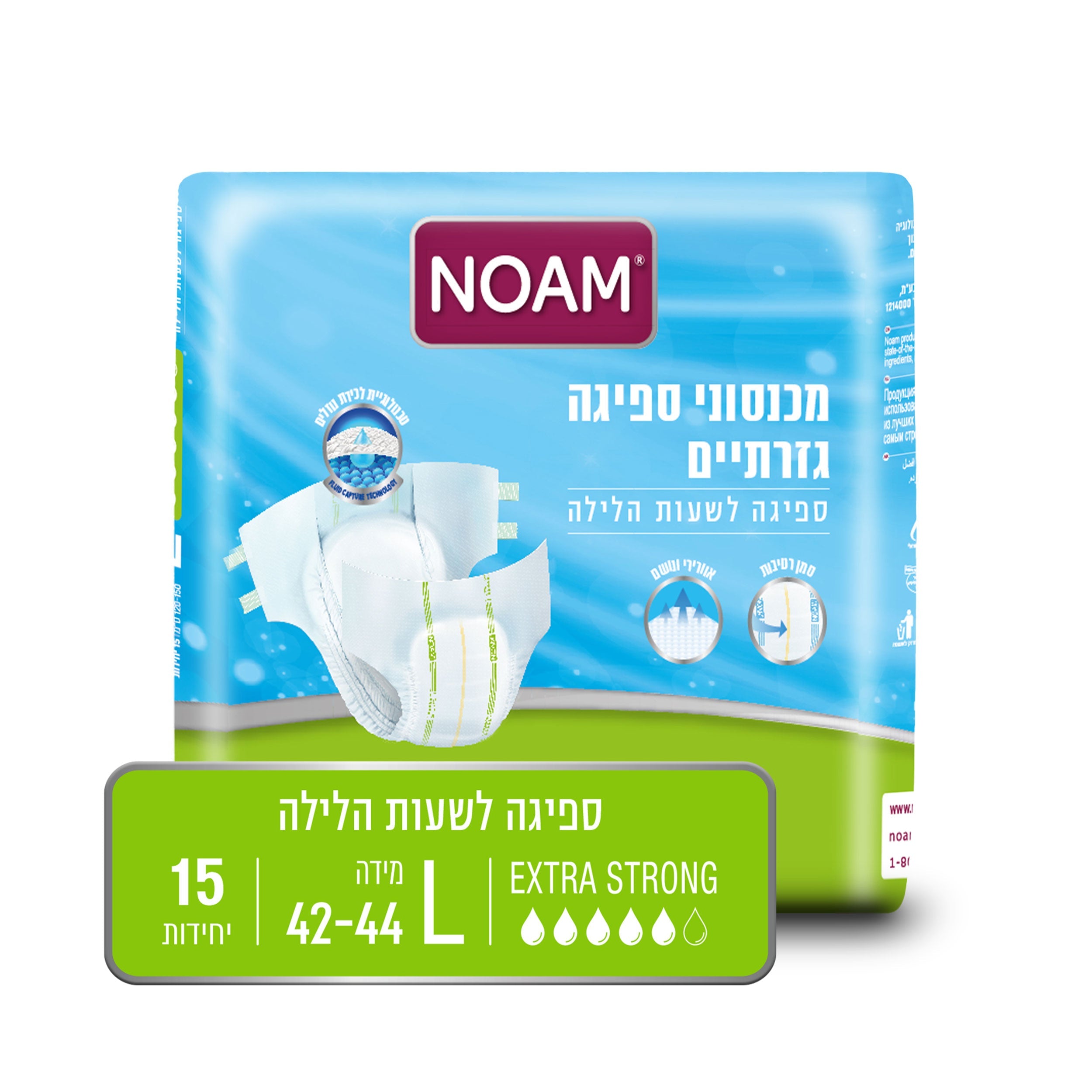 חיתול נועם (מכנסון) לספיגה לשעות הלילה. נושם, גזרתי, אלסטי וגמיש להתאמה אנטומית מושלמת. בעל מגע רך ונעים, מרכז ספיגה לתחושת יובש, שכבה לוכדת נוזלים להגנה מוגברת ולמניעת דליפות וסמן רטיבות בגב החיתול. מוצרי נועם מיוצרים בטכנולוגיה מתקדמת וממיטב המרכיבים תוך עמידה במבחני איכות מחמירים. מיוצר בישראל. מידה L- היקף מותניים 120-150 ס"מ, מידת מכנסיים 42-44. כמות 15 יח' באריזה.