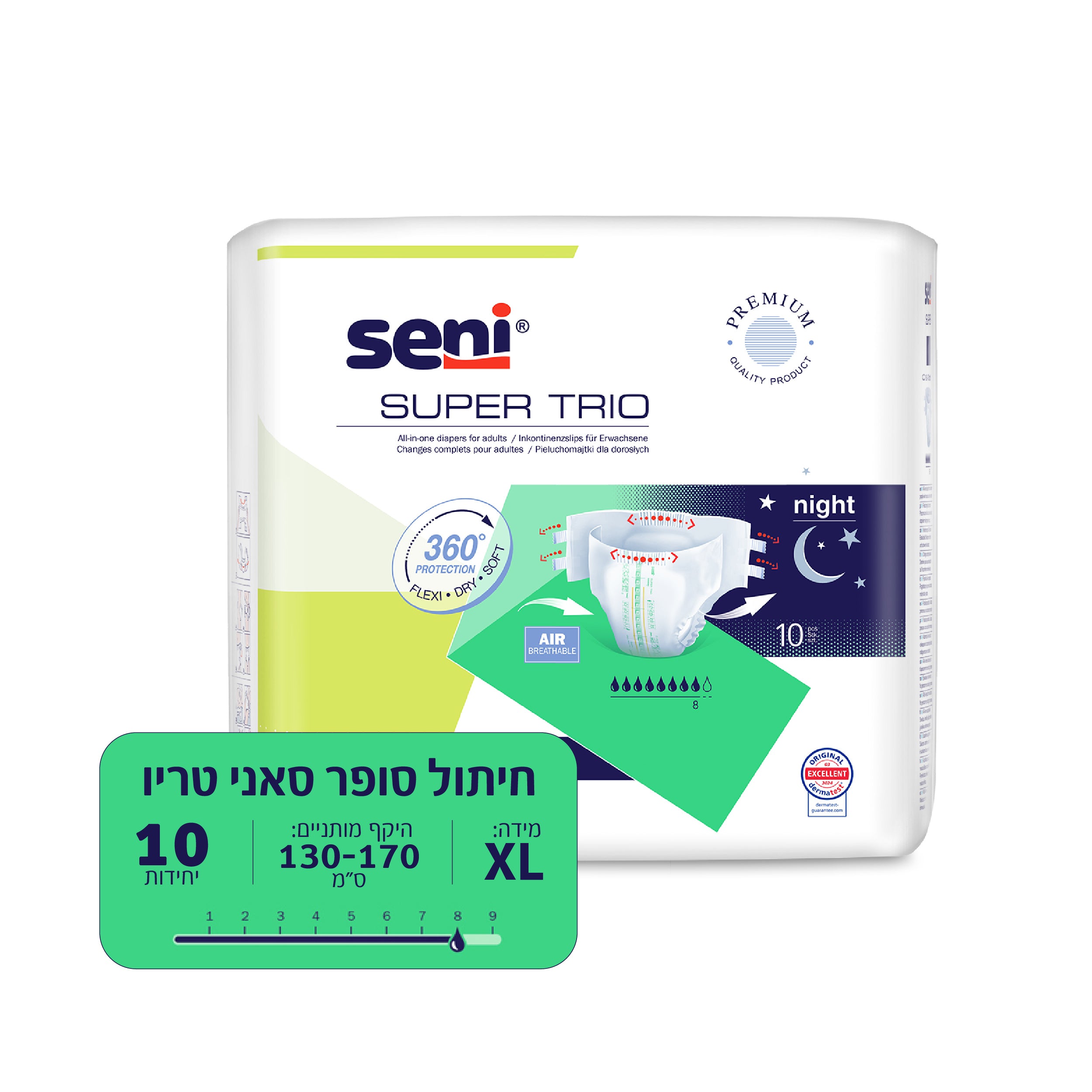 שכבה חיצונית חדירה לאוויר המסייעת לעור לנשום. בעלי סמן רטיבות המראה מתי נדרש להחליף וקירות הגנה מפני נזילות מהצדדים, רצועות אלסטיות קדמית ואחורית המאפשרות התאמה אידיאלית לגוף ומערכת סגירה רב פעמית. כמות טיפות 8 מתוך 9. כמות באריזה 10 יח'. היקף מותניים 130-170 ס"מ. סאני הוא מותג בינלאומי הנמכר ביותר מ-80 מדינות ומציע מגוו פתרונות ספיגה.