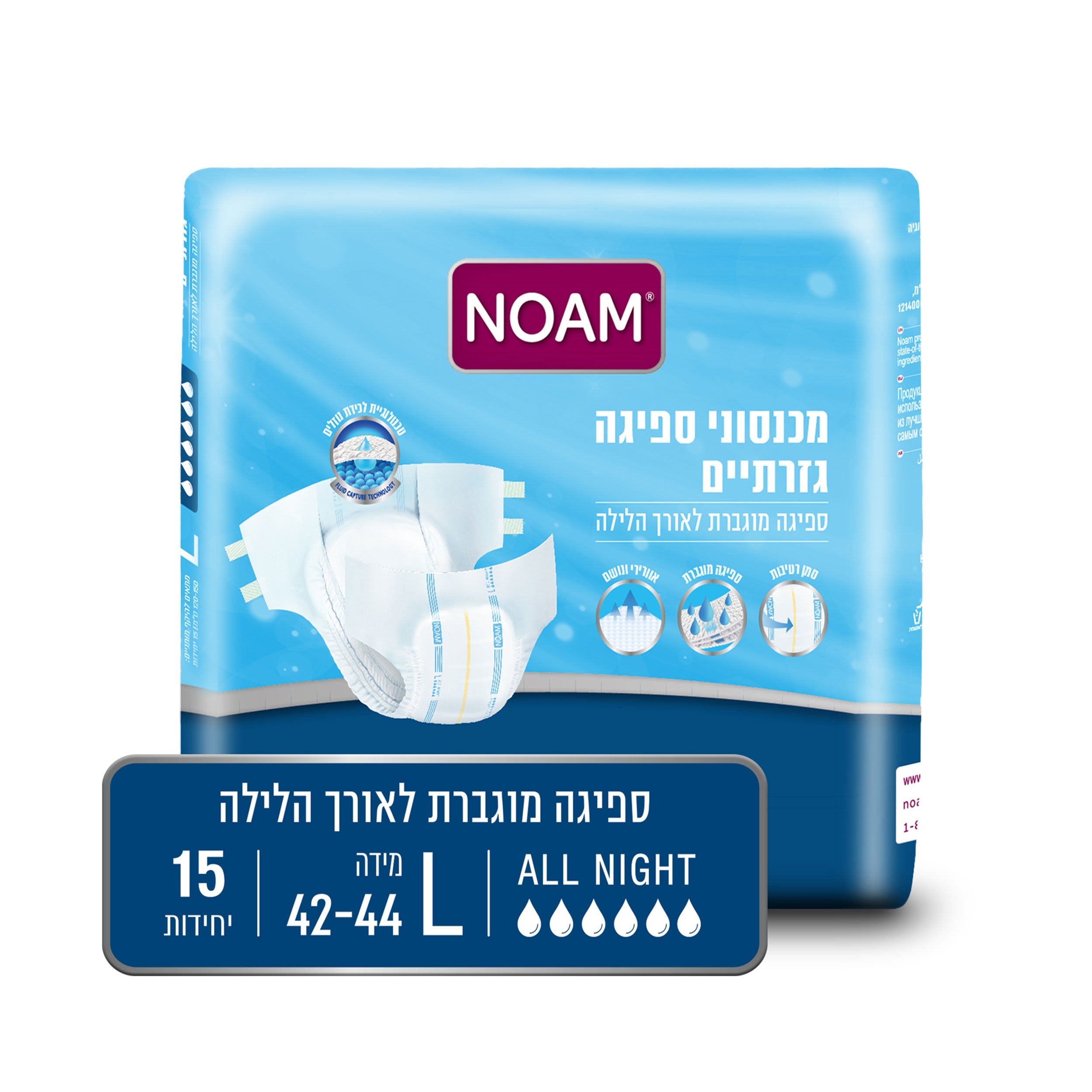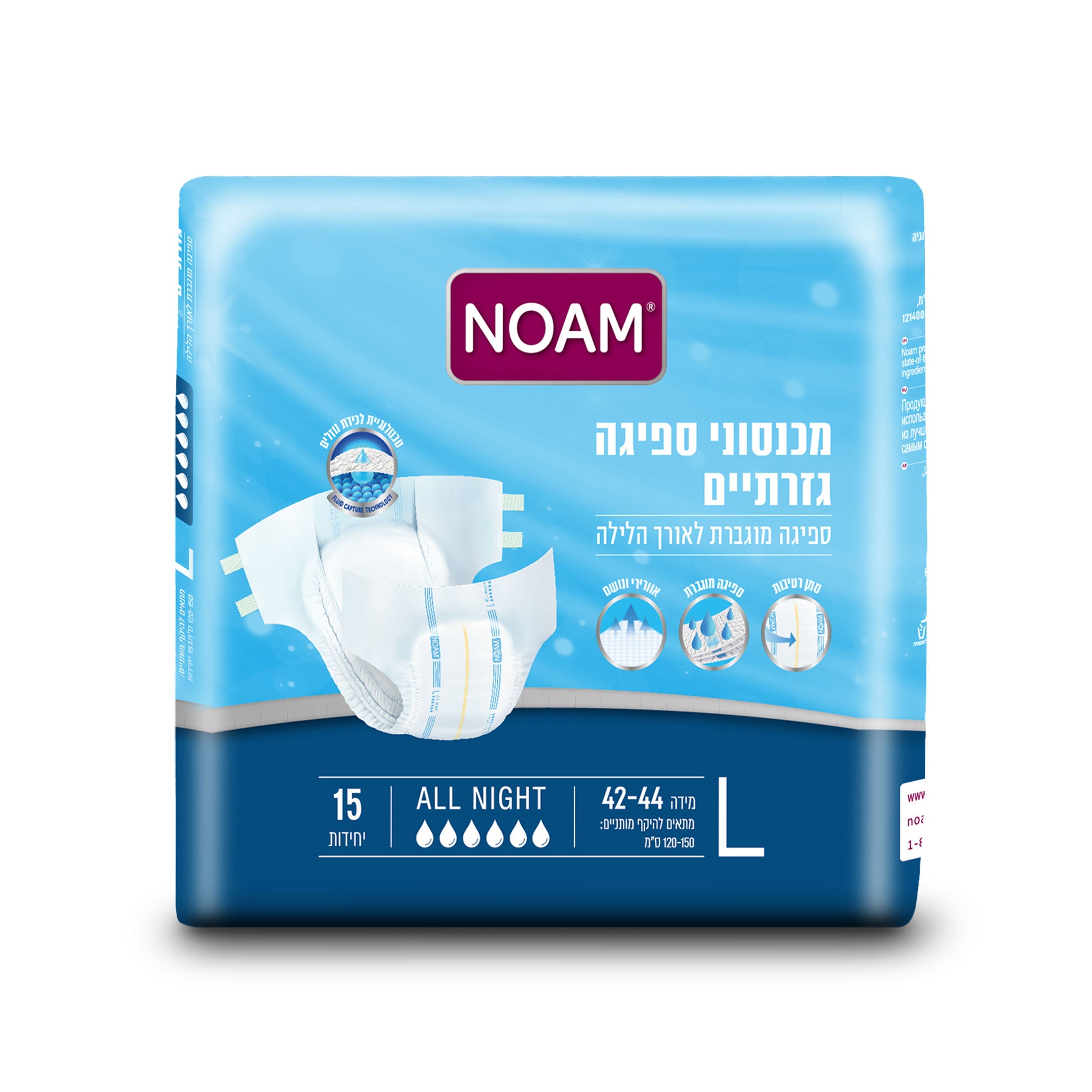 חיתול נועם (מכנסון) לספיגה מוגברת לאורך הלילה. חיתול נושם, גזרתי, אלסטי וגמיש להתאמה אנטומית מושלמת בעל מגע רך ונעים, מרכז ספיגה לתחושת יובש, שכבה לוכדת נוזלים להגנה מוגברת ולמניעת דליפות וסמן רטיבות בגב החיתול. מוצרי נועם מיוצרים באיכות גבוהה וממיטב המרכיבים תוך עמידה במבחני איכות מוקפדים. מיוצר בישראל. מידה L- היקף מותניים 120-150 ס"מ, מידת מכנסיים 42-44.כמות 15 יח' באריזה בודדת.