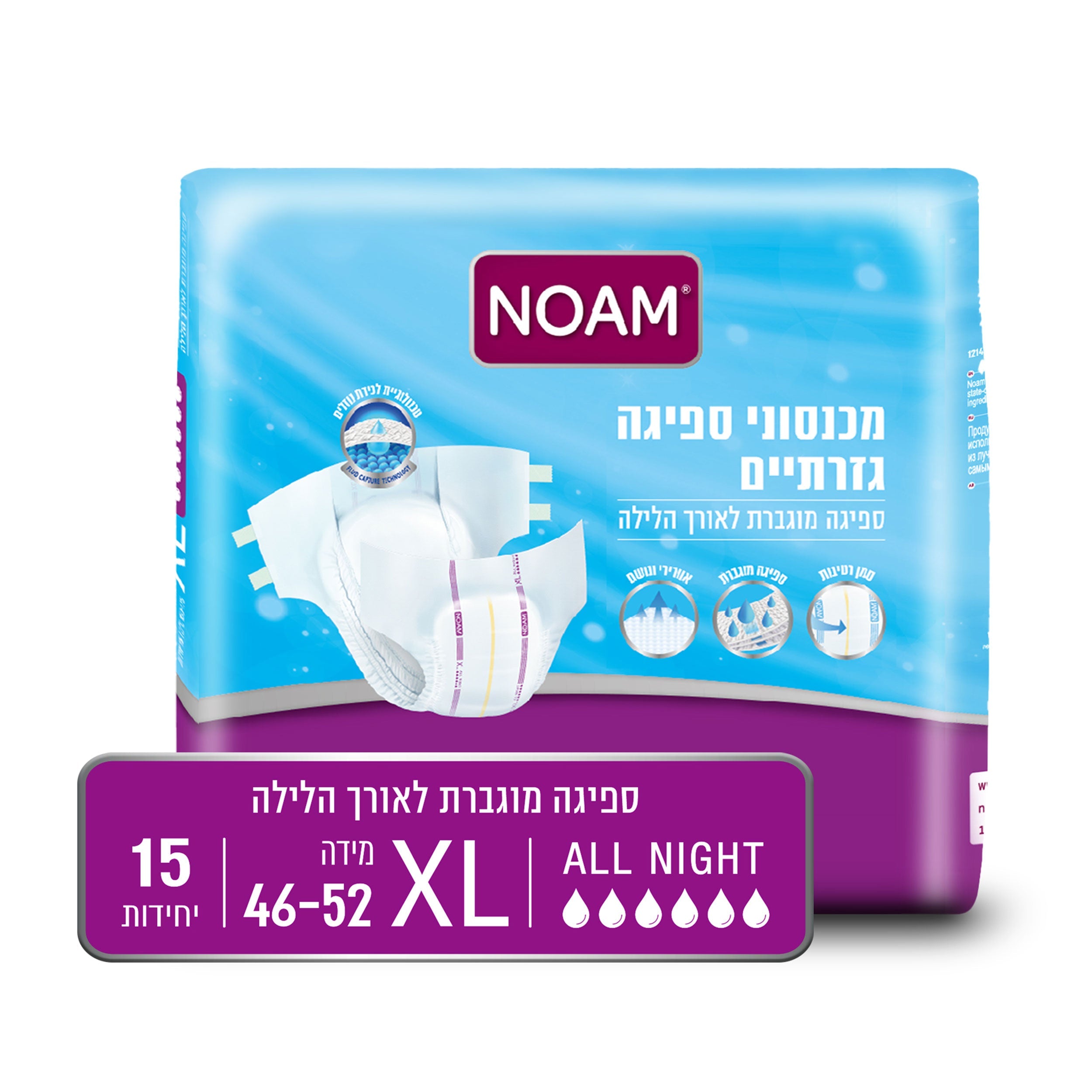 חיתול נועם (מכנסון) לספיגה מוגברת לאורך הלילה. חיתול נושם, גזרתי, אלסטי וגמיש להתאמה אנטומית מושלמת בעל מגע רך ונעים, מרכז ספיגה לתחושת יובש, שכבה לוכדת נוזלים להגנה מוגברת ולמניעת דליפות וסמן רטיבות בגב החיתול. מוצרי נועם מיוצרים באיכות גבוהה וממיטב המרכיבים תוך עמידה במבחני איכות מוקפדים. מיוצר בישראל. מידה XL- היקף מותניים 150-175 ס"מ, מידת מכנסיים 46-52. כמות 15 יח' באריזה בודדת.