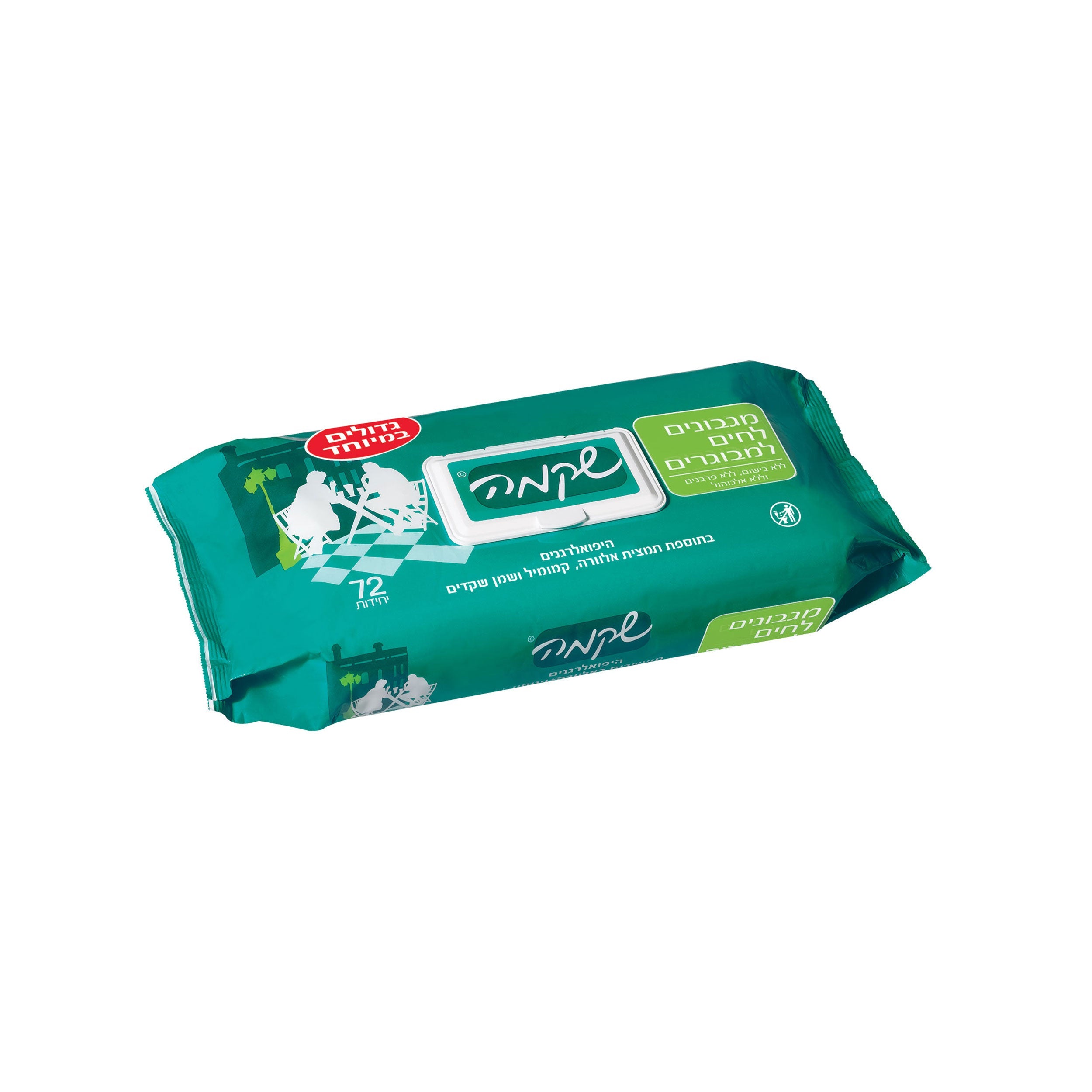 מגבונים לחים של שקמה למבוגרים,  מגבונים ייעודיים לשמירת ההיגיינה של מבוגרים. המגבונים הלחים אינם מכילים בושם ואלכוהול ומועשרים באלוורה ובויטמין E. החבילה בעלת סגירה נוחה לשימוש רב פעמי. ברשיון משרד הבריאות. 72 יחדות באריזה.