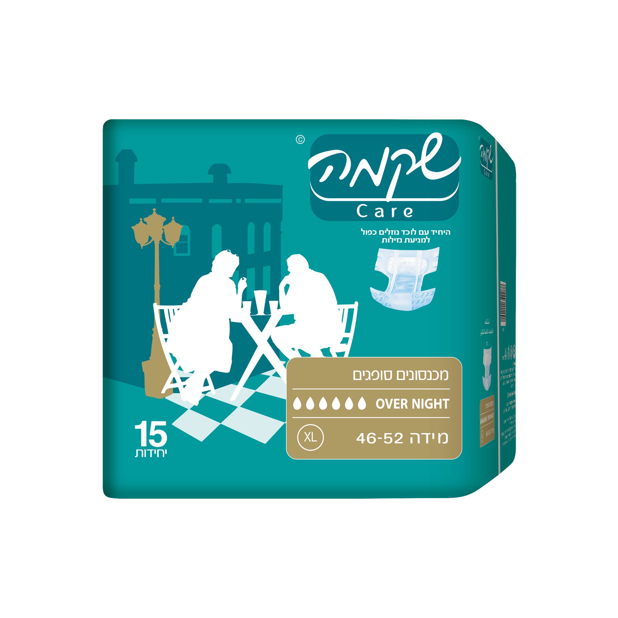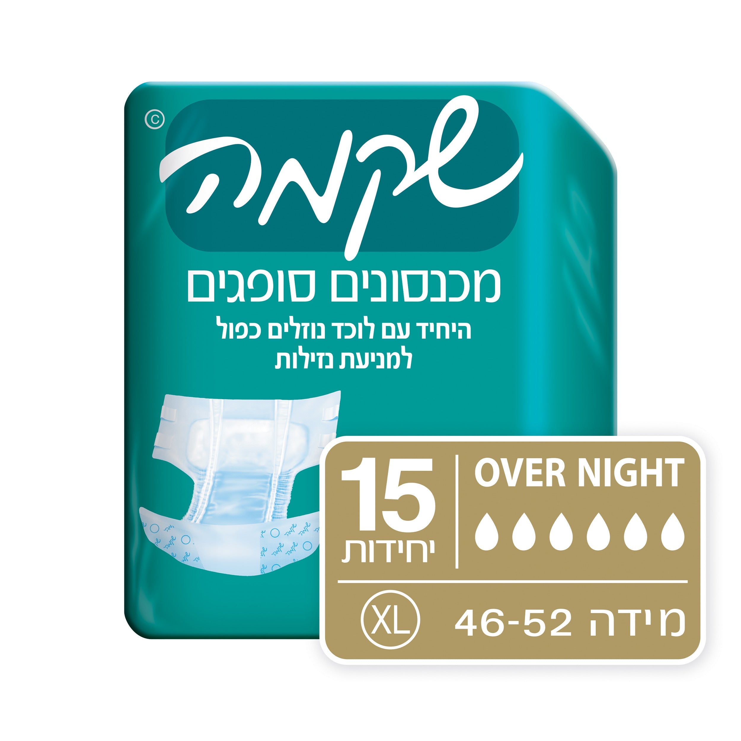 מכנסונים (חיתולים) גזרתיים לילה - אובר נייט שקמה. מכנסונים בעלי כושר ספיגה של עד 12 שעות ומתאימים לשימוש במהלך הלילה. למכנסונים שכבות פנימית וחיצונית נושמות ואווריריות המסייעות במניעת גירויים ולוכד נוזלים כפול המונע נזילות. המכנסונים מגיעים עם מנגנון סגירה רב פעמית. כמות באריזה 15 יח'. XL - מידת מכנסיים 46-52.